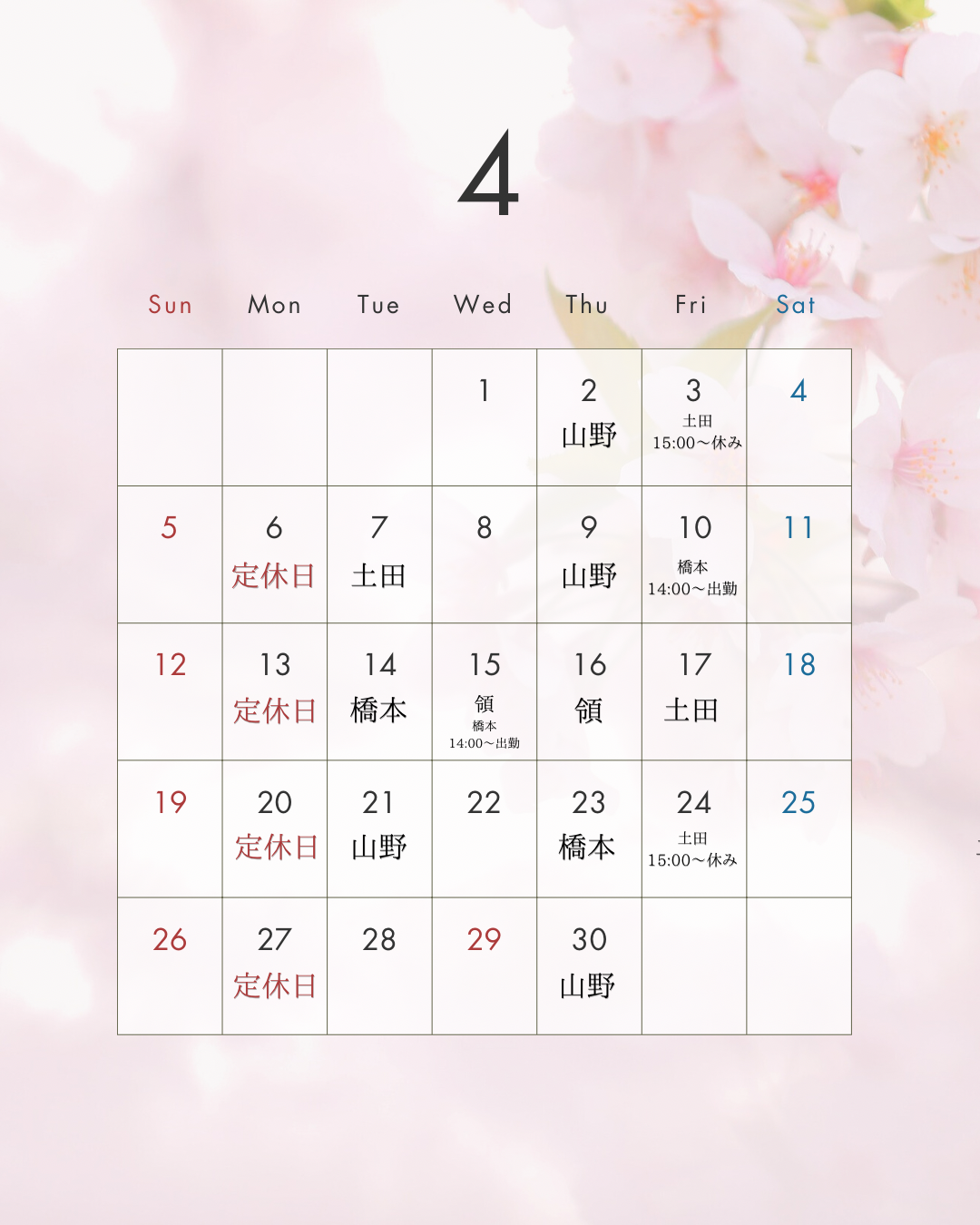 カレンダー 休業日 営業日 シンプル 4月 2026年 桜 ピンク インスタグラムの投稿
